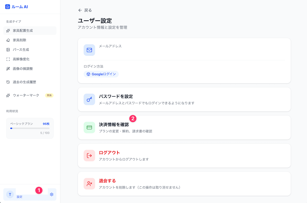 1. 設定画面から決済情報を確認に遷移します