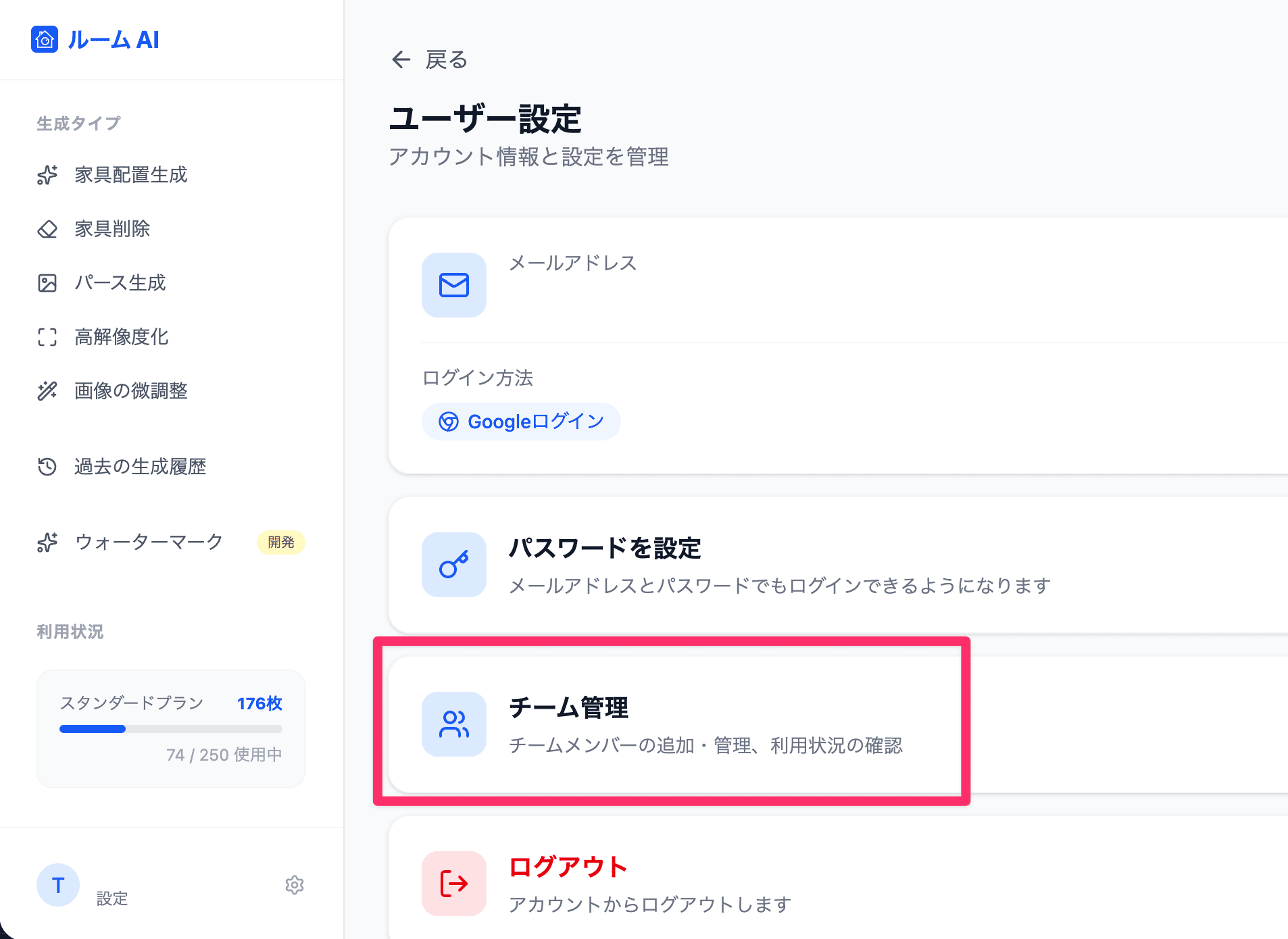 チーム管理画面では、主に以下の3つの操作を行うことができます。
