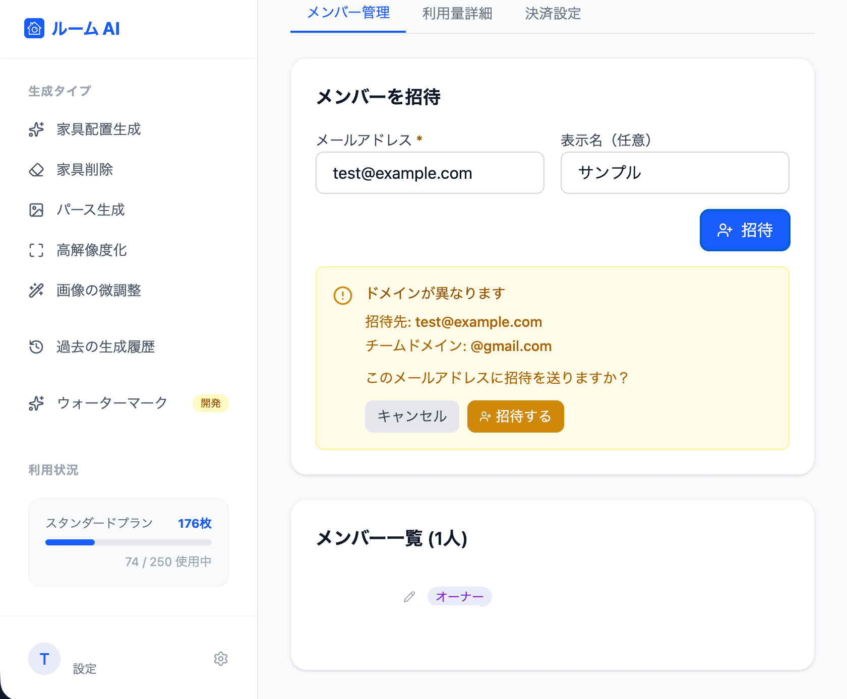 - オーナーとドメインが違うアカウントの場合、誤招待を防ぐために一度確認が入ります。