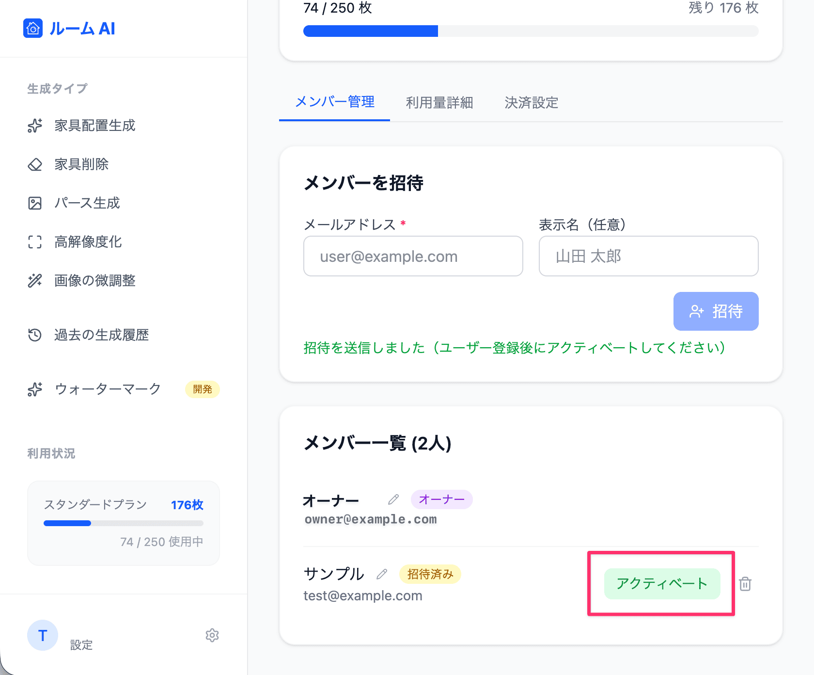 【重要】 登録後にチーム管理画面に表示される 「アクティベート」ボタン を押すことで、正式にチームに追加されます。