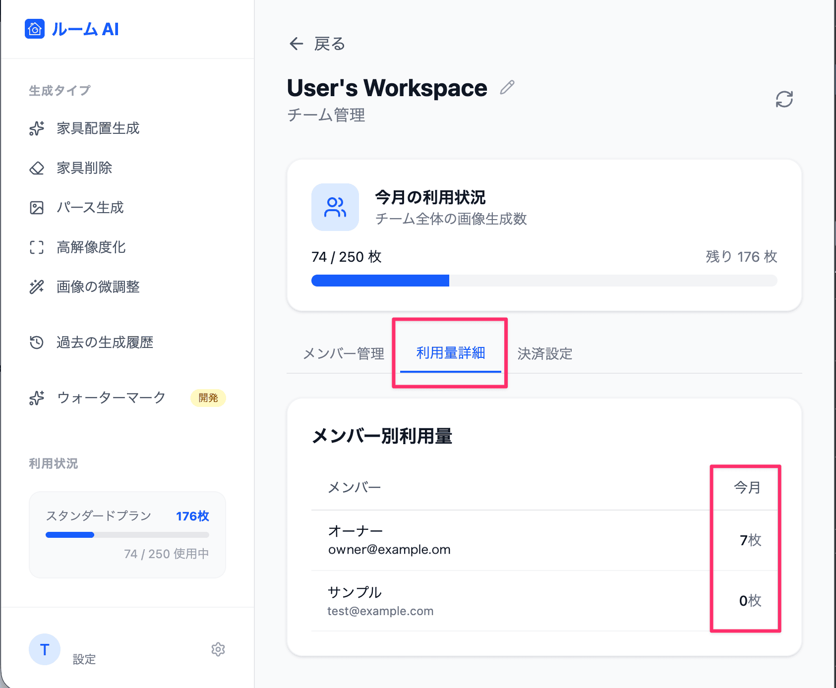 - 「利用料確認」画面にて、対象期間中に各メンバーが何枚画像を生成したかを確認することができます。